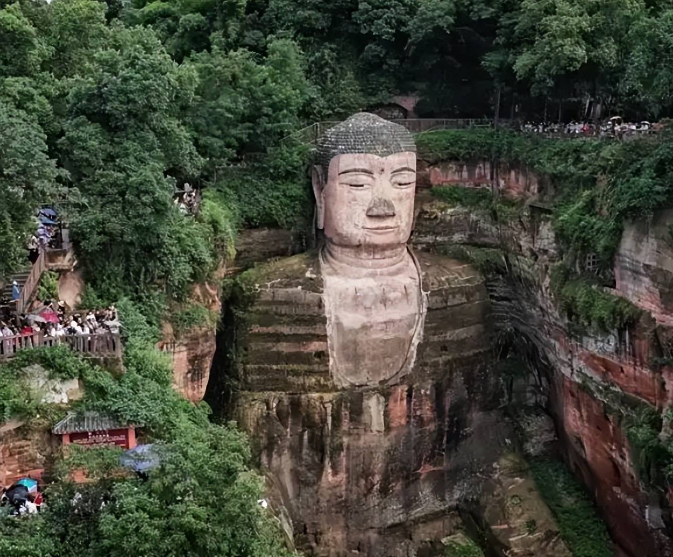 乐山的魂,藏在乐山大佛的庄严法相里。这座凿刻于唐代开元元年的弥勒坐像,背靠凌云山,面朝三江汇流处,通高 71 米,是世界现存最大的石刻弥勒佛像,被誉为 “山是一尊佛,佛是一座山”。清晨的大佛景区,薄雾尚未散尽,江面上水汽氤氲,游客们沿着九曲栈道缓缓下行,栈道紧贴佛身,最窄处仅容一人通行,抬头望去,大佛的垂耳、慈眉、善目清晰可见,手掌心可容纳数十人站立,脚趾甲上能坐下四人,其宏伟规模让人惊叹古人的智慧与毅力。