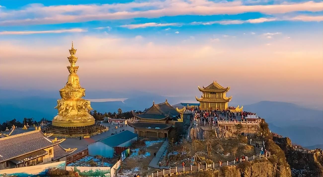 峨眉山的核心景观是金顶。乘坐观光车抵达雷洞坪,再换乘索道前往金顶,索道穿行在云海之上,脚下是茫茫云海,远处的山峰如孤岛般漂浮在云端,宛如仙境。金顶的 “十方普贤菩萨” 像高 48 米,由 660 吨青铜铸造,表面鎏金,在阳光照射下熠熠生辉,菩萨手持如意,面带微笑,俯瞰众生;“金顶华藏寺” 是峨眉山的最高寺庙,寺内的 “大雄宝殿”“普贤殿” 等建筑气势恢宏,香火缭绕中,满是禅意;“舍身崖” 是俯瞰云海的最佳位置,清晨时分,云海在脚下翻涌如涛,阳光穿透云层洒下,形成 “佛光” 奇观 —— 光环内人影晃动,宛如 “佛现其身”,让人惊叹自然的神奇。